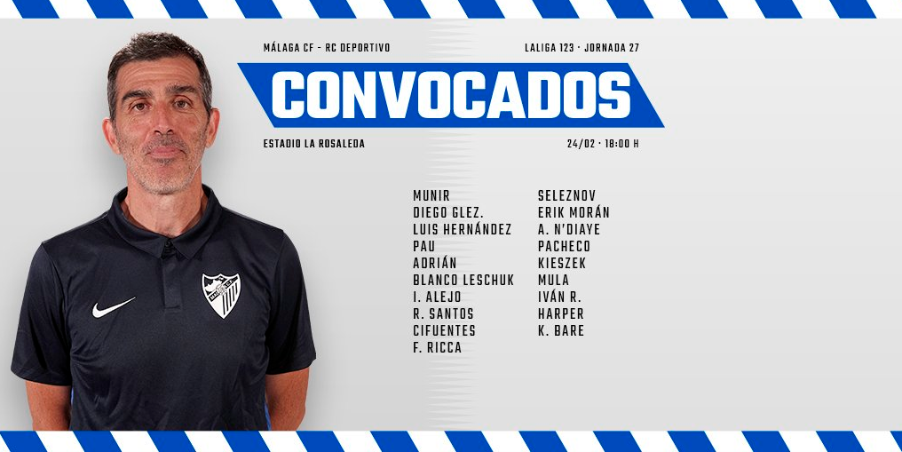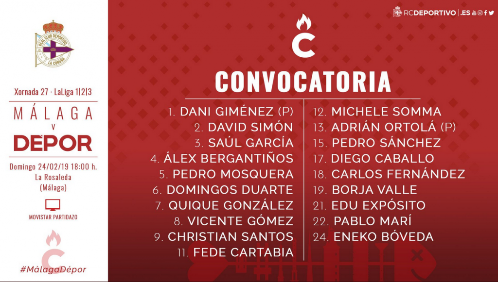 Los ausentes. Didier Moreno y Nahuel están sancionados y no pueden entrar en la convocatoria de Natxo, que no ha citado al fabrilista Joni Montiel. En el Málaga vuelven dos futbolistas que cumplieron castigo la pasada jornada, Blanco Leschuk y Keita Baré. Lombán y Jaime se caen de la lista, en la que tampoco entran Brezancic, Boulahroud, el meta Werner y el burbujeante Ontiveros, que tan malos ratos hizo pasar al Deportivo en pasados duelos.