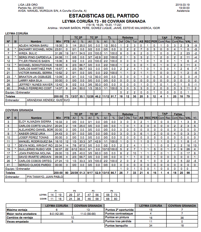 El histórico Granada sentenció en el inicio del último cuarto del partido con un parcial 2-13 que le disparó en un duelo que había sido igualado hasta entonces y con frecuentes ventajas coruñesas. Las hostilidades empezaron bien pronto desde la línea de tres, con Bulic, Pino y Ogbueze atinados en los tres primeros intentos y Uchendu intimidador bajo tableros. Para entonces ya se echaba de menos a Monaghan, que sigue prisionero de la irregularidad y firmó una mala actuación, sin anotación. Todo un hándicap para el Basquet Coruña, que tanto necesita del talento de su base y sobre todo, y esto ya es una cuestión colectiva, de fajarse en los rebotes.